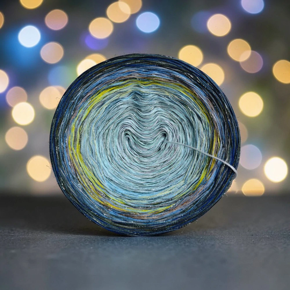 Složení jedné vložené tenké nitky se třpytivým efektem: 70 % viskóza, 15 % polyester, 15% lurexový polyester
