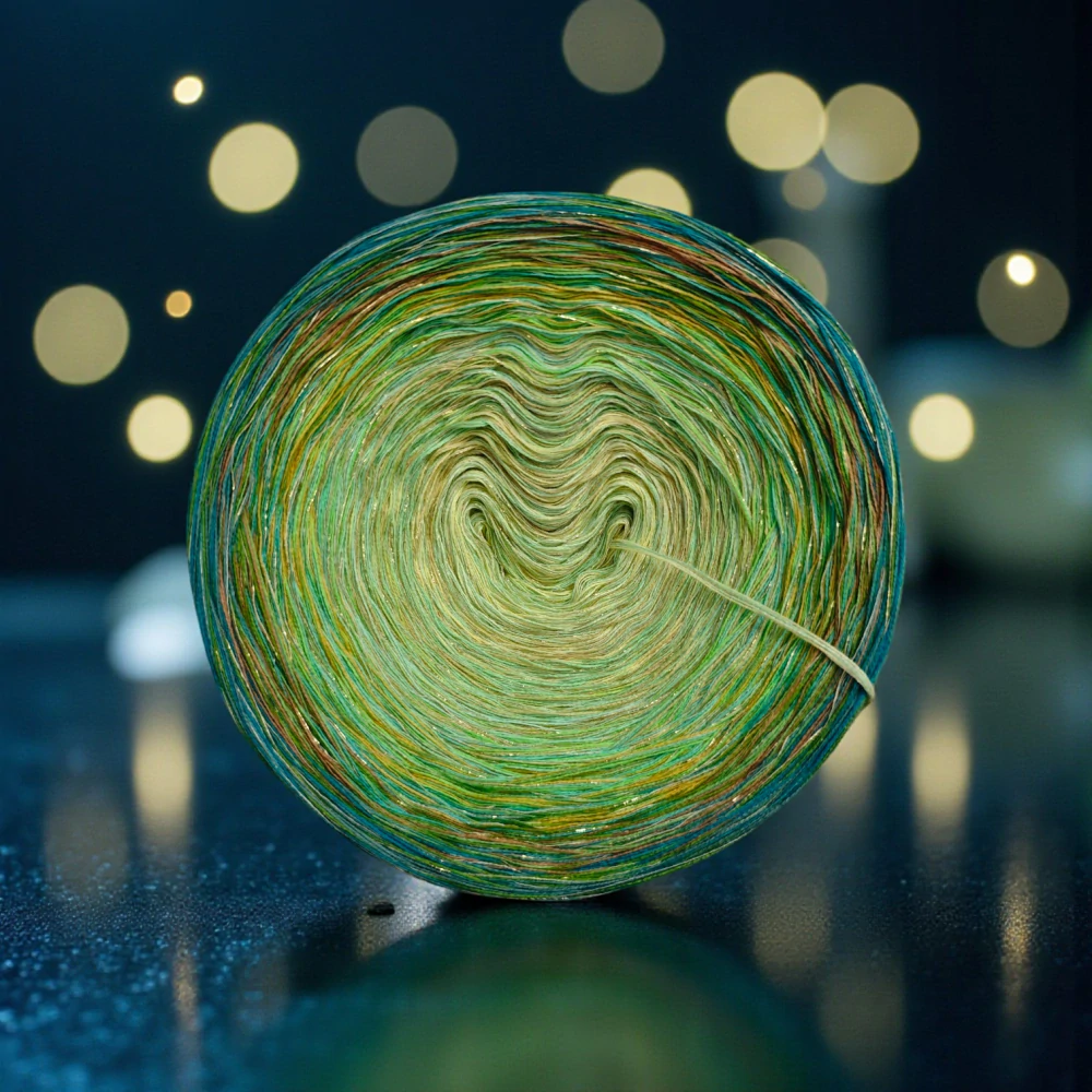 Složení jedné vložené tenké nitky se třpytivým efektem: 70 % viskóza, 15 % polyester, 15% lurexový polyester
