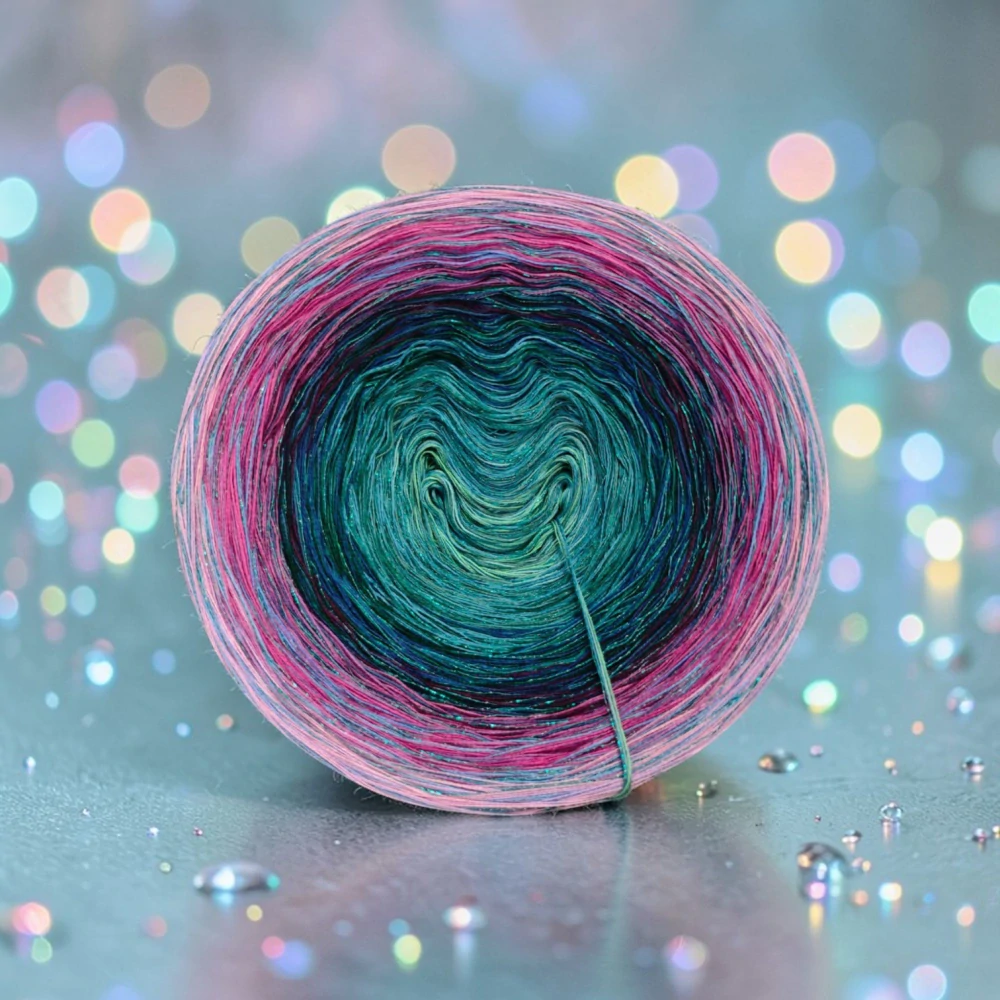 Složení jedné vložené tenké nitky se třpytivým efektem:  70 % viskóza, 15 % polyester, 15% lurexový polyester