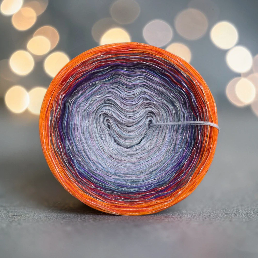 Složení jedné vložené tenké nitky se třpytivým efektem:  70 % viskóza, 15 % polyester, 15% lurexový polyester