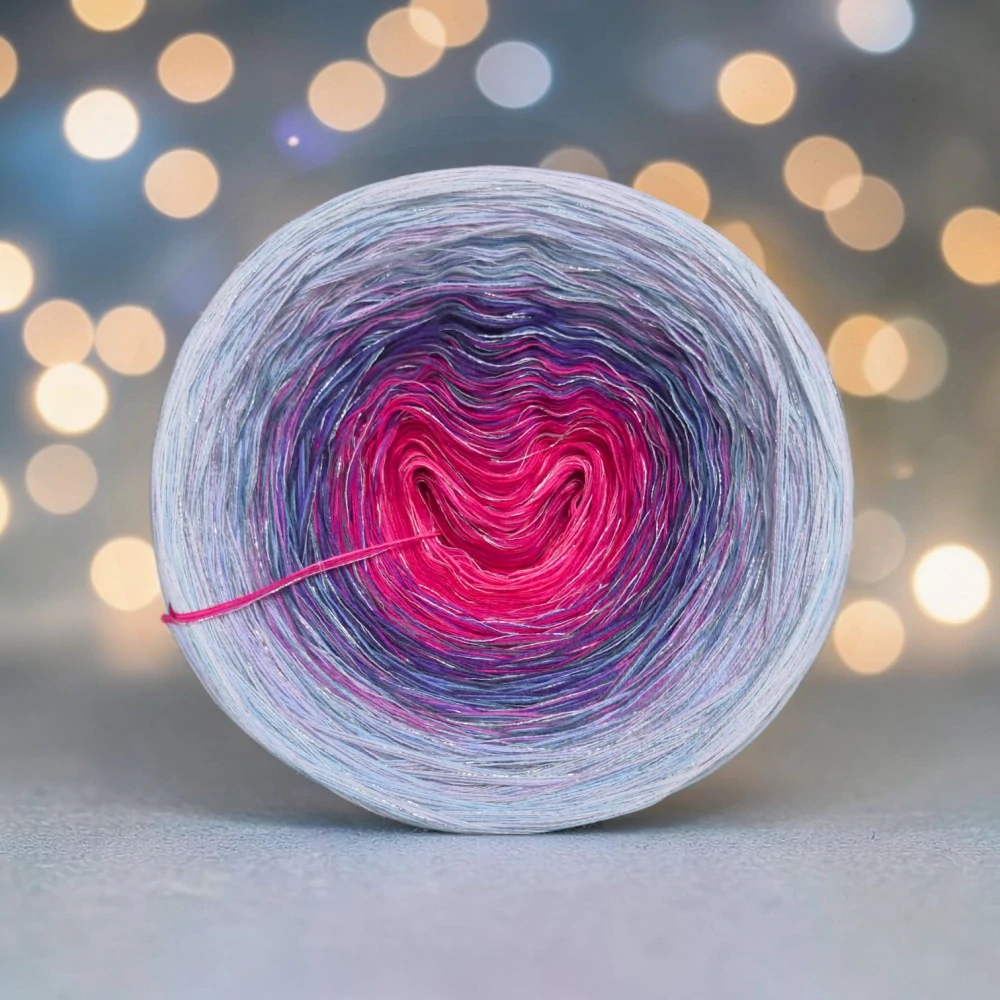 Složení jedné vložené tenké nitky se třpytivým efektem: 70 % viskóza, 15 % polyester, 15% lurexový polyester