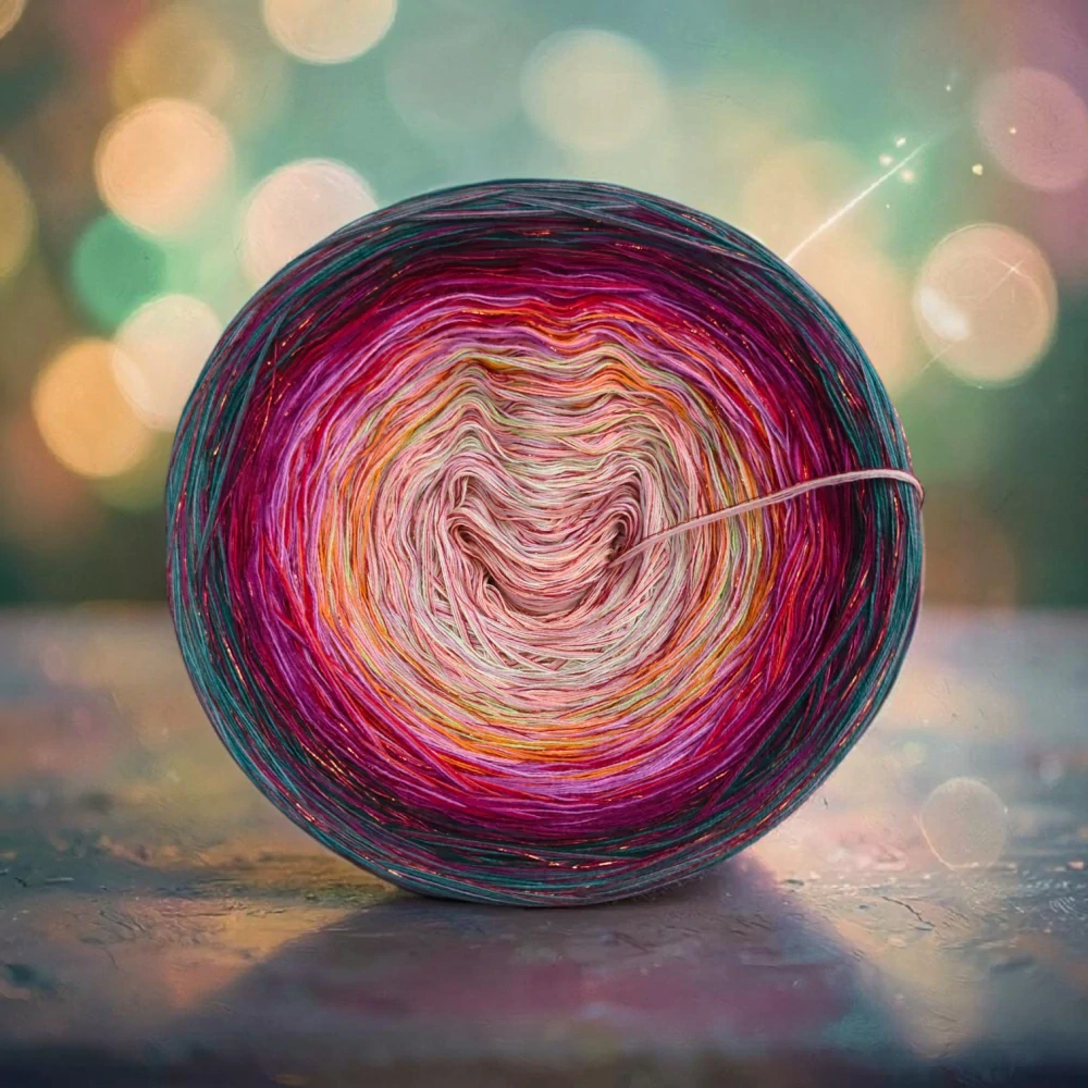 Složení jedné vložené tenké nitky se třpytivým efektem: 70 % viskóza, 15 % polyester, 15% lurexový polyester