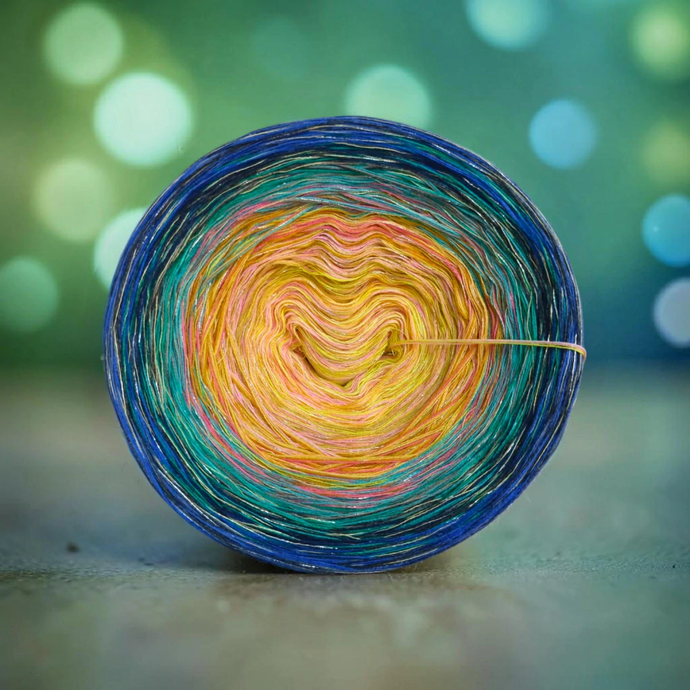 Složení jedné vložené tenké nitky se třpytivým efektem: 70 % viskóza, 15 % polyester, 15% lurexový polyester