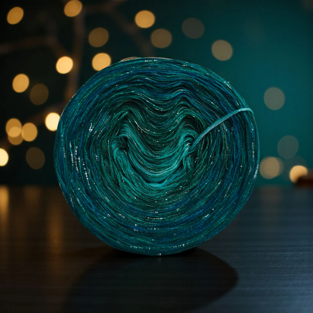 Složení jedné vložené tenké nitky se třpytivým efektem:  70 % viskóza, 15 % polyester, 15% lurexový polyester