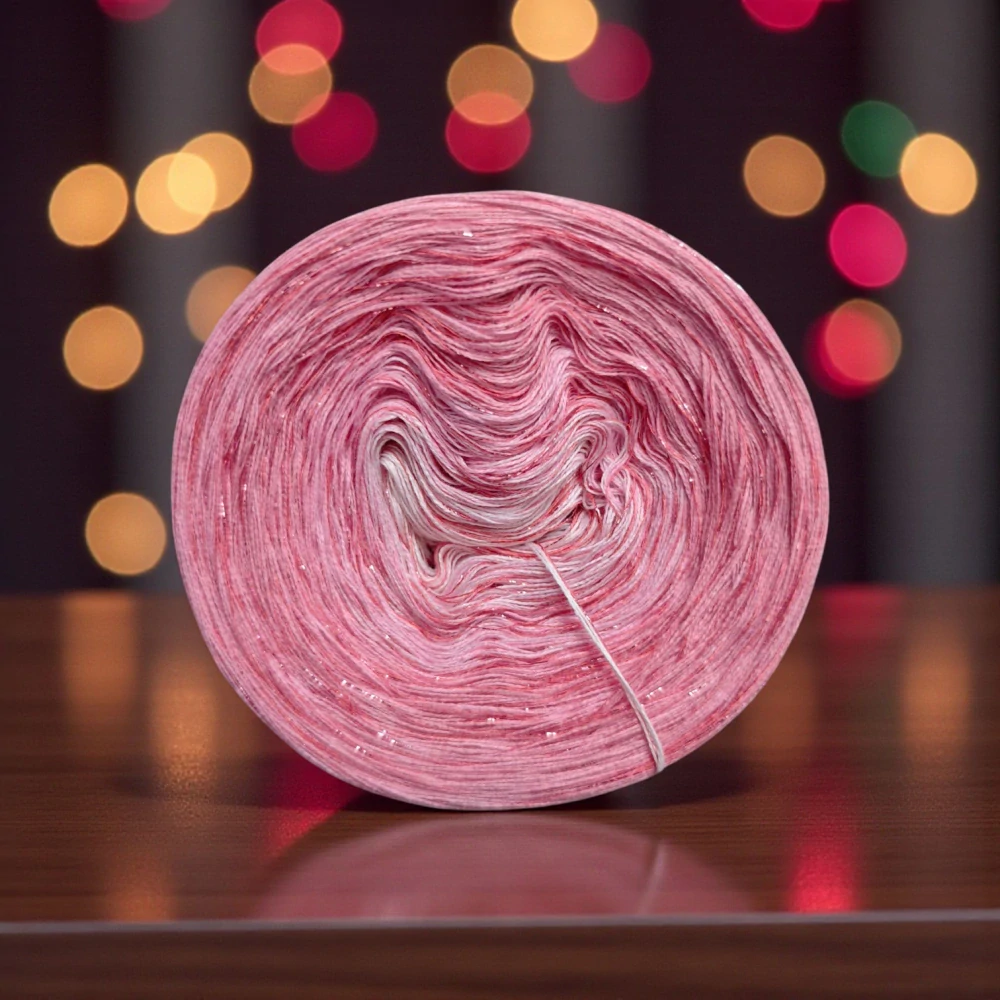 Složení jedné vložené tenké nitky se třpytivým efektem:  70 % viskóza, 15 % polyester, 15% lurexový polyester