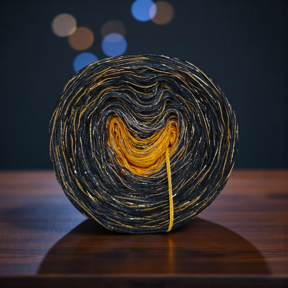 Složení jedné vložené tenké nitky se třpytivým efektem:  70 % viskóza, 15 % polyester, 15% lurexový polyester