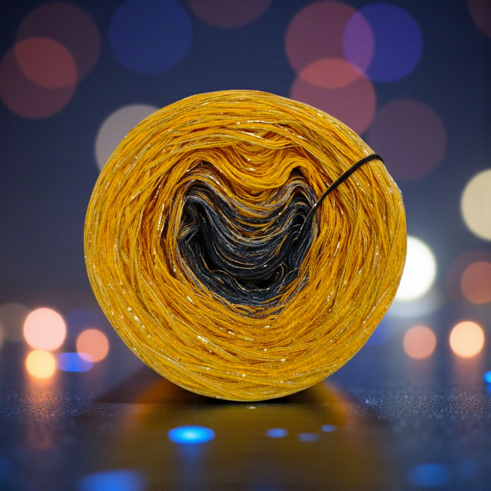 Složení jedné vložené tenké nitky se třpytivým efektem:  70 % viskóza, 15 % polyester, 15% lurexový polyester