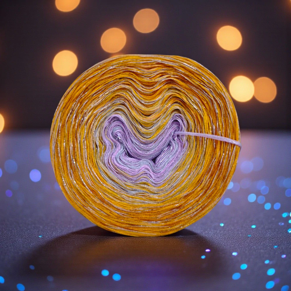 Složení jedné vložené tenké nitky se třpytivým efektem:  70 % viskóza, 15 % polyester, 15% lurexový polyester