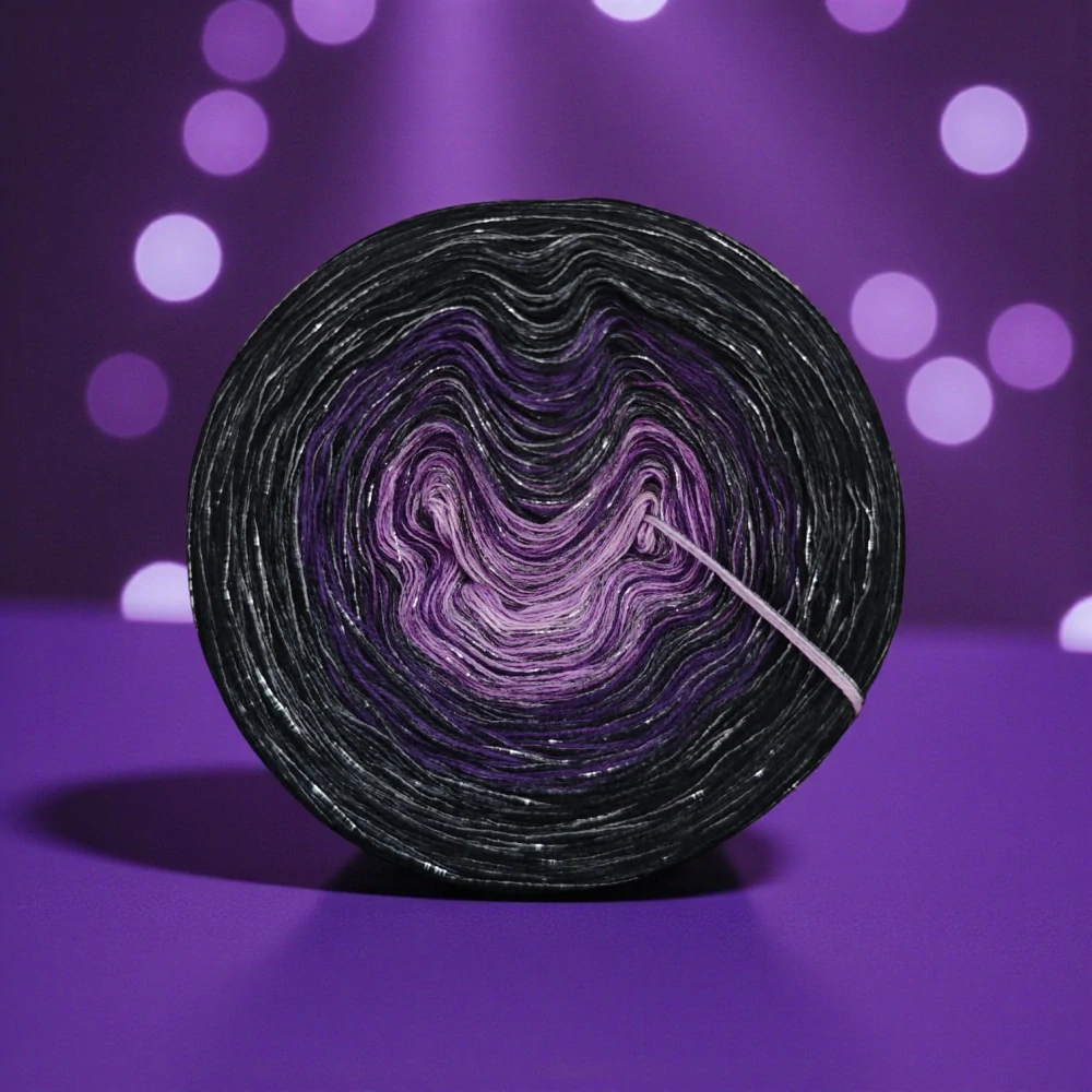 Složení jedné vložené tenké nitky se třpytivým efektem: 70 % viskóza, 15 % polyester, 15% lurexový polyester