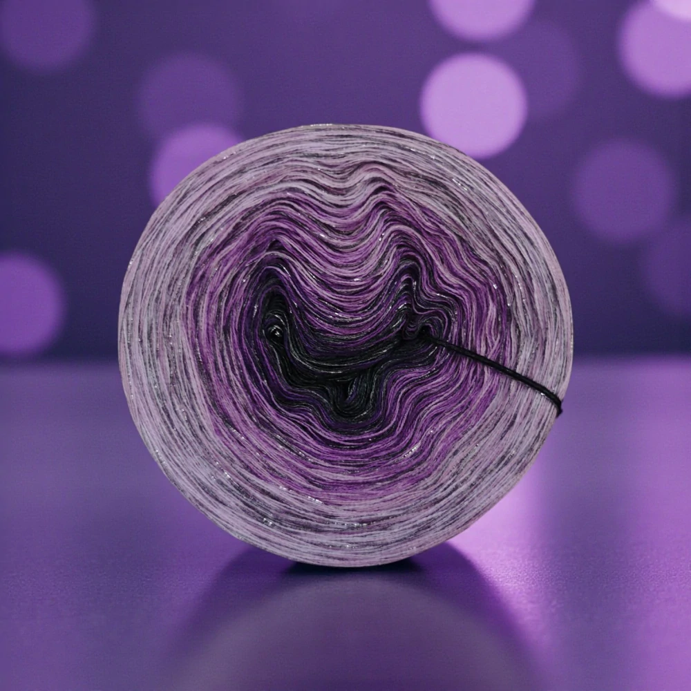 Složení jedné vložené tenké nitky se třpytivým efektem:  70 % viskóza, 15 % polyester, 15% lurexový polyester