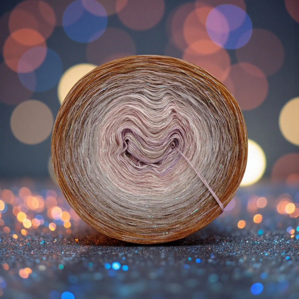 Složení jedné vložené tenké nitky se třpytivým efektem: 70 % viskóza, 15 % polyester, 15% lurexový polyester