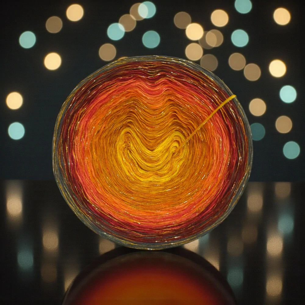 Složení jedné vložené tenké nitky se třpytivým efektem:  70 % viskóza, 15 % polyester, 15% lurexový polyester