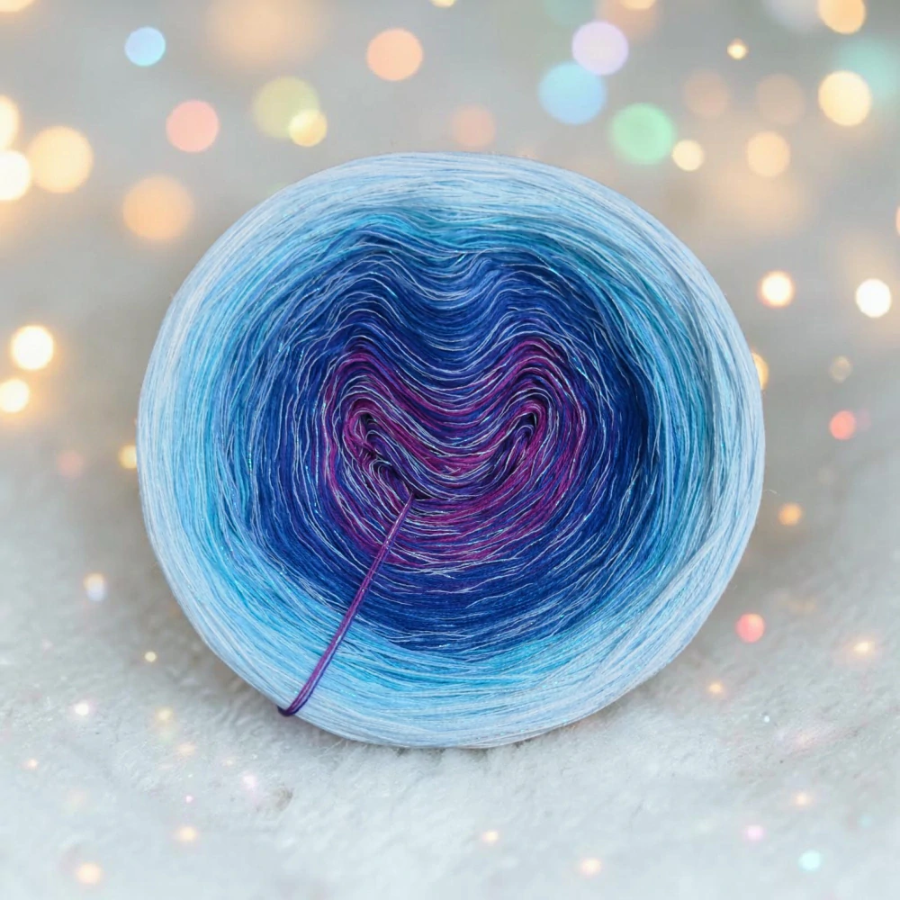 Složení jedné vložené tenké nitky se třpytivým efektem:  70 % viskóza, 15 % polyester, 15% lurexový polyester