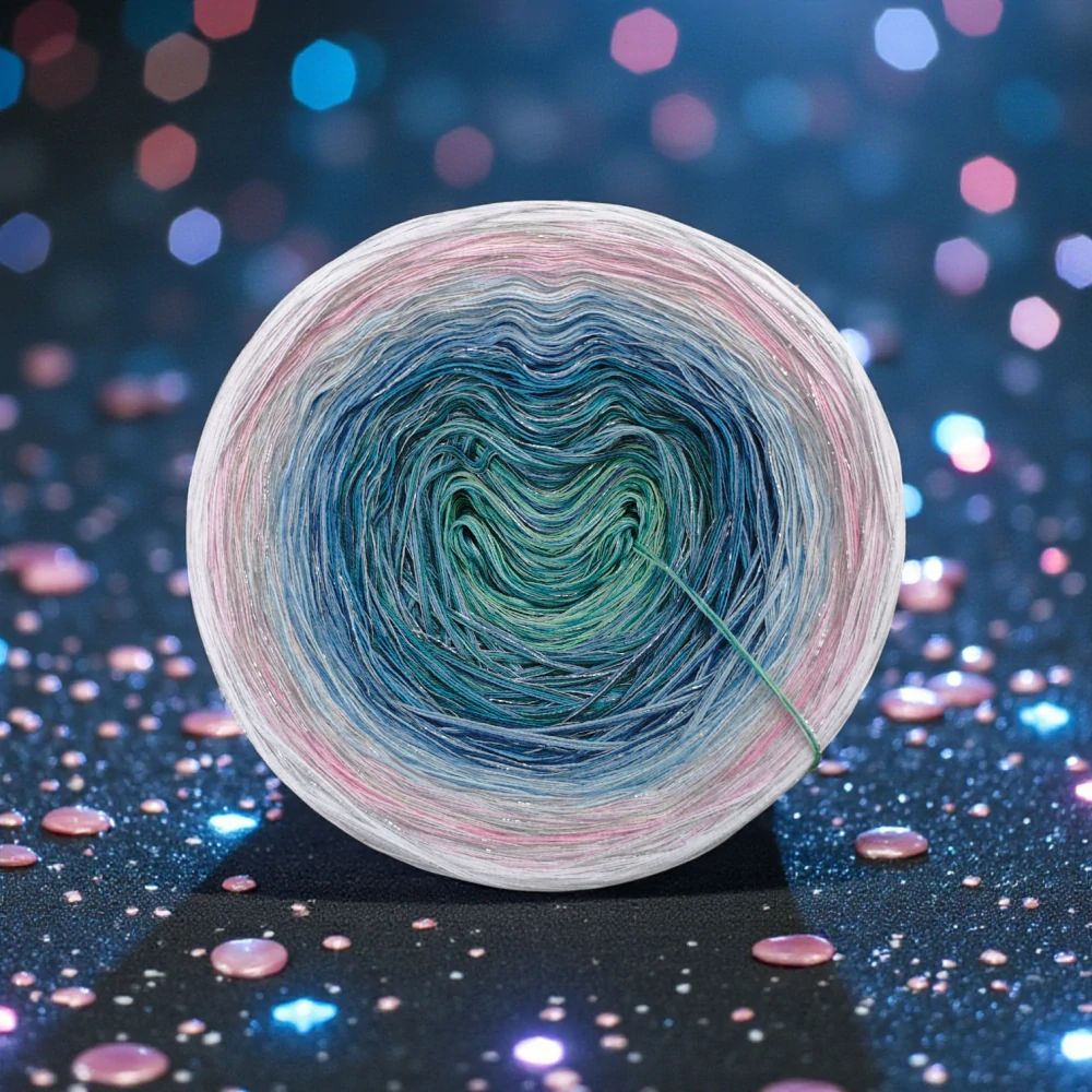 Složení jedné vložené tenké nitky se třpytivým efektem:  70 % viskóza, 15 % polyester, 15% lurexový polyester