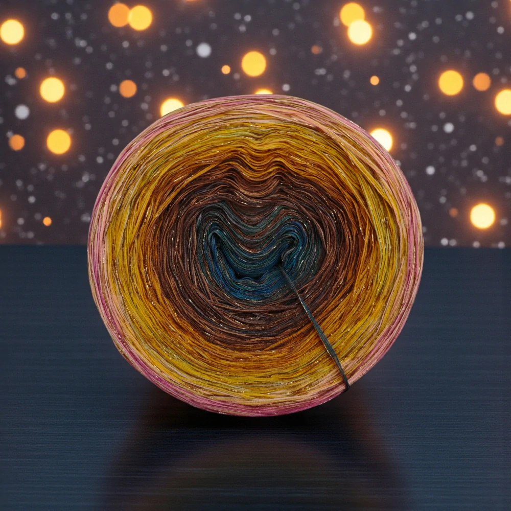 Složení jedné vložené tenké nitky se třpytivým efektem:  70 % viskóza, 15 % polyester, 15% lurexový polyester
