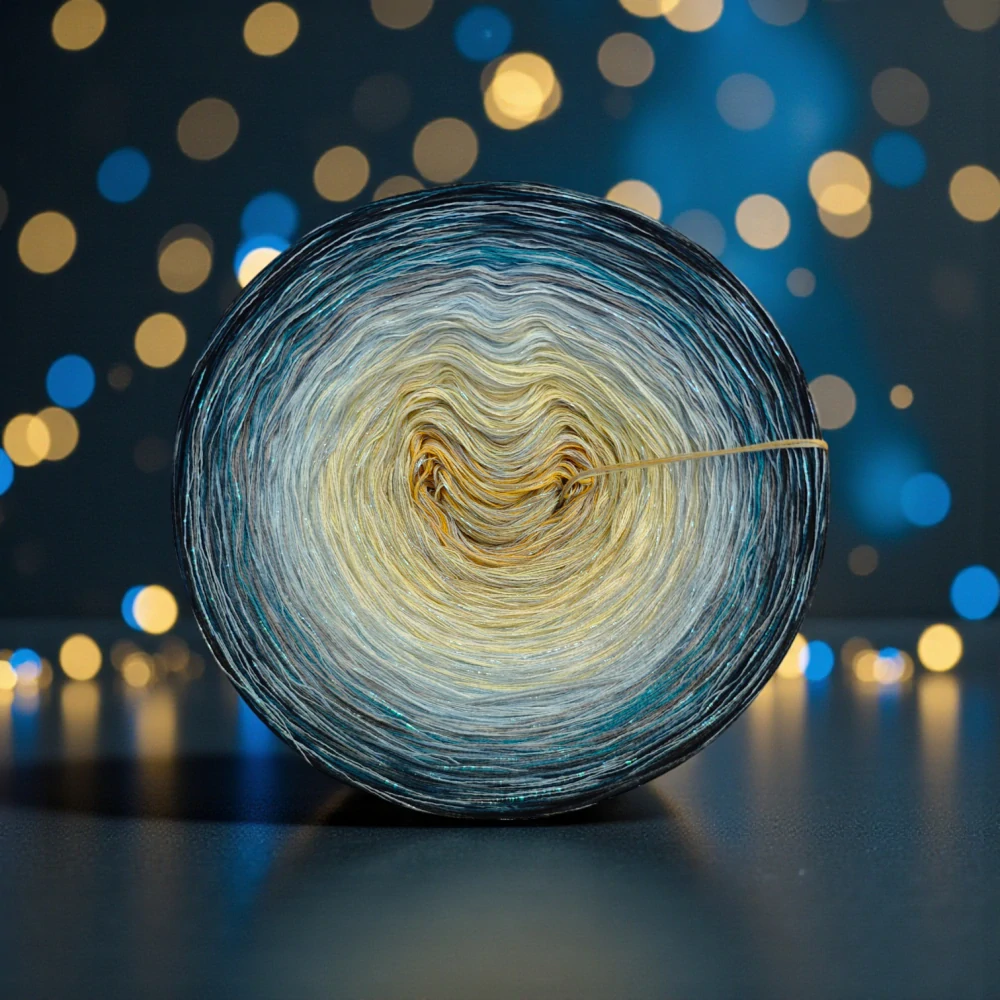 Složení jedné vložené tenké nitky se třpytivým efektem:  70 % viskóza, 15 % polyester, 15% lurexový polyester