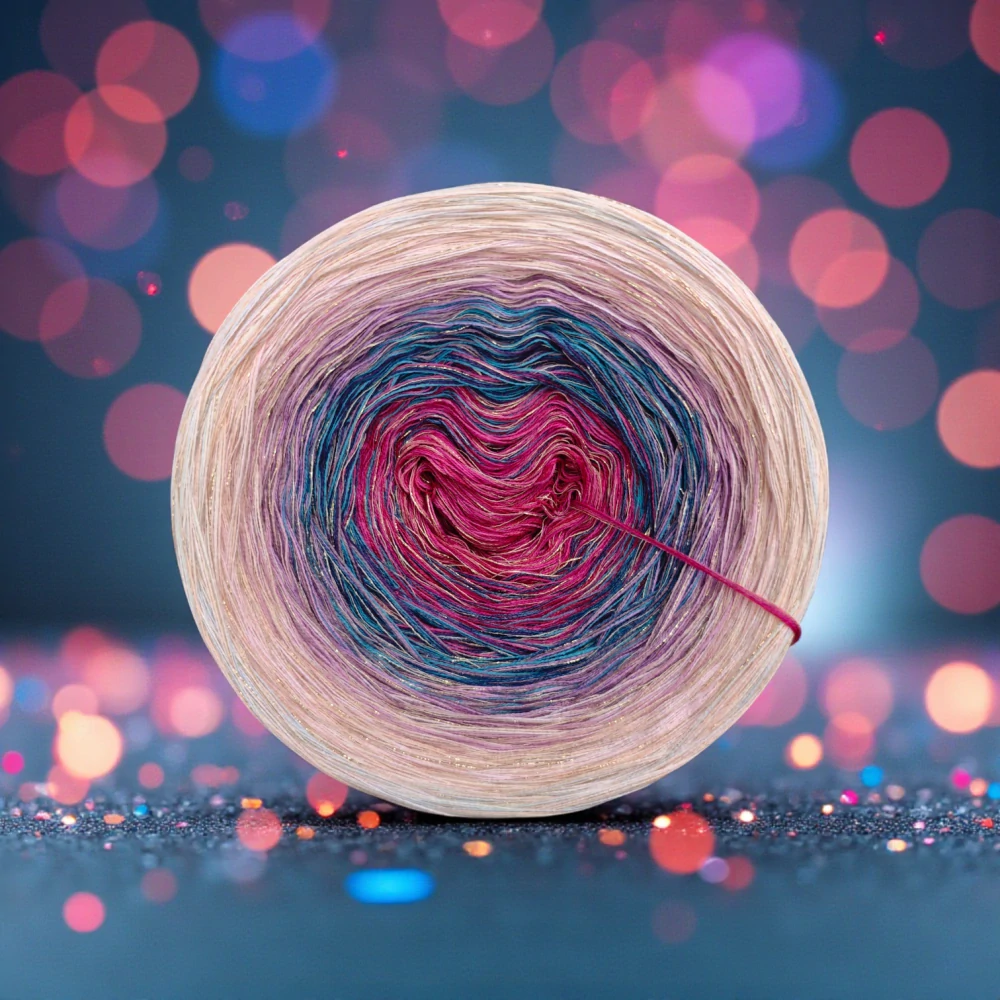 Složení jedné vložené tenké nitky se třpytivým efektem:  70 % viskóza, 15 % polyester, 15% lurexový polyester